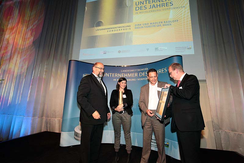Ein Sonderpreis ging an die Geschäftsführer Dirk und Madlen Radloff der „radlon touristik GbR aus Waren (Müritz) für „Innovationen im Tourismus“. Die Unternehmer haben mit dem „radlon“ Deutschlands erstes Fahrrad-Komfort-Hotel aufgebaut. „Wer im Wettbewerb mithalten will, muss sich stetig weiterentwickeln. In Waren (Müritz) ist ein ideenreiches Angebot mit einem Rundum-Service für Radtouristen entstanden. Von der Zimmer- und Hotelausstattung über Radvermietung und Pannenservice bis zum gastronomischen Angebot ist alles auf die Gästegruppe der Radfahrer ausgerichtet“, sagte Glawe.